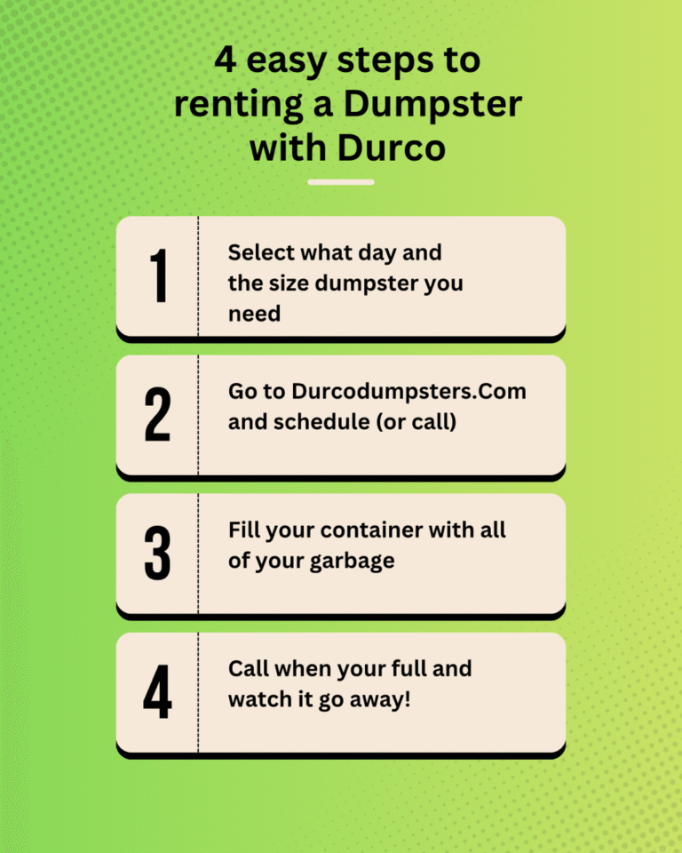 Discover the simplicity of managing your project’s waste with Durco Dumpster Rental. Our easy booking and pickup process meets the diverse needs of both residential and commercial customers. We are punctual, professional, and will ensuring your experience with us is hassle-free. With a variety of 15 and 20 yard dumpster sizes, we’re equipped to handle any project, promising a timely and effective waste management solution. Choose Durco for reliable dumpster rental services, and make waste management the easiest part of your project. construction site, or clearing out a commercial space anywhere in the Tulsa Metro area,